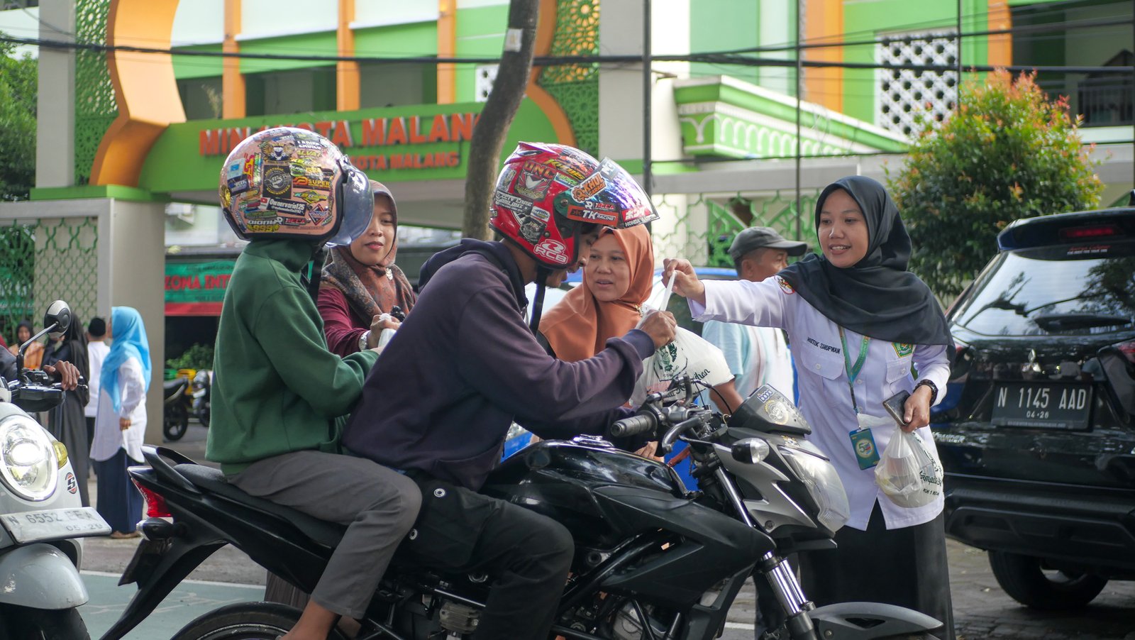 Kepala MIN 1 Kota Malang, Hj. Siti Aisah, S.Ag., M.Pd., juga turun langsung membagikan paket takjil kepada pengguna jalan. Bahkan, ia sempat naik ke dalam bus Trans Jatim untuk menyerahkan paket makanan berbuka secara langsung kepada para penumpang.