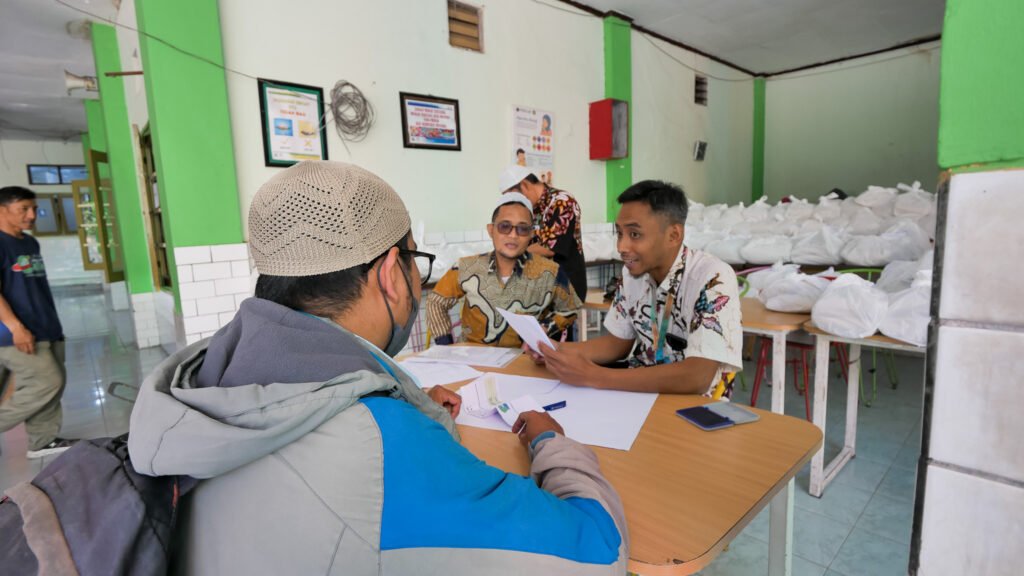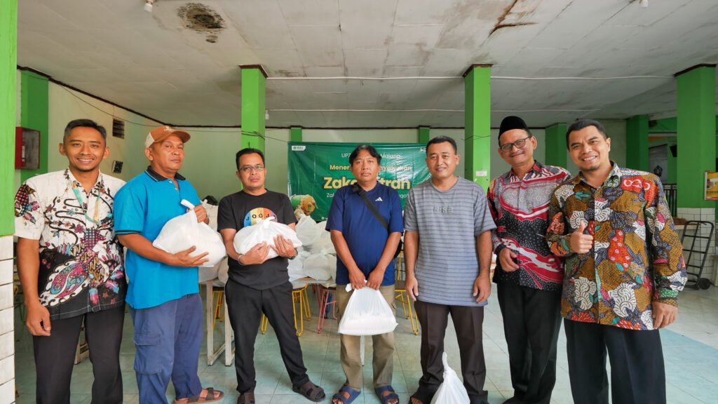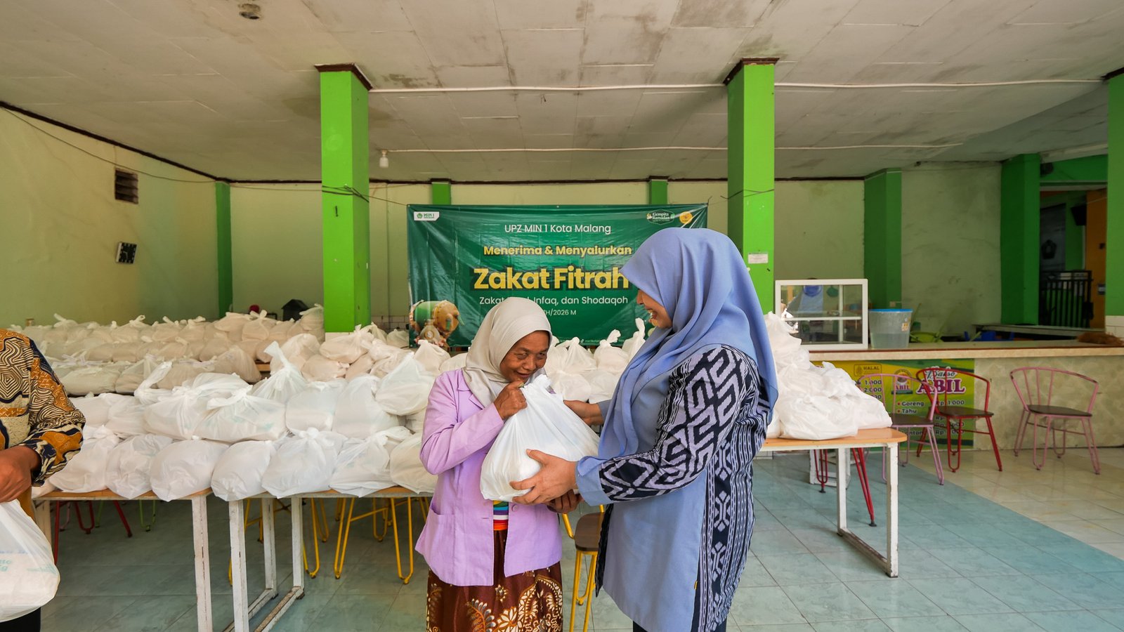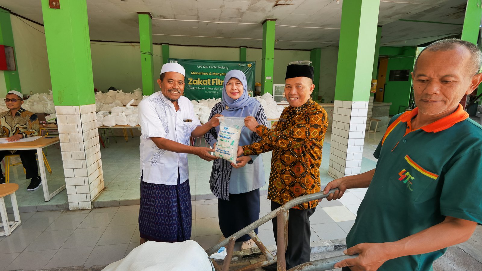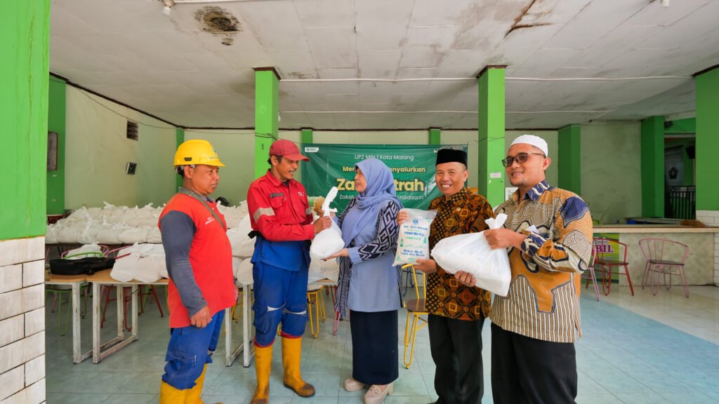 Kepala MIN 1 Kota Malang, Hj. Siti Aisah, S.Ag., M.Pd., turut hadir dan secara langsung mengawal proses pembagian zakat agar penyalurannya berjalan tertib dan tepat sasaran.