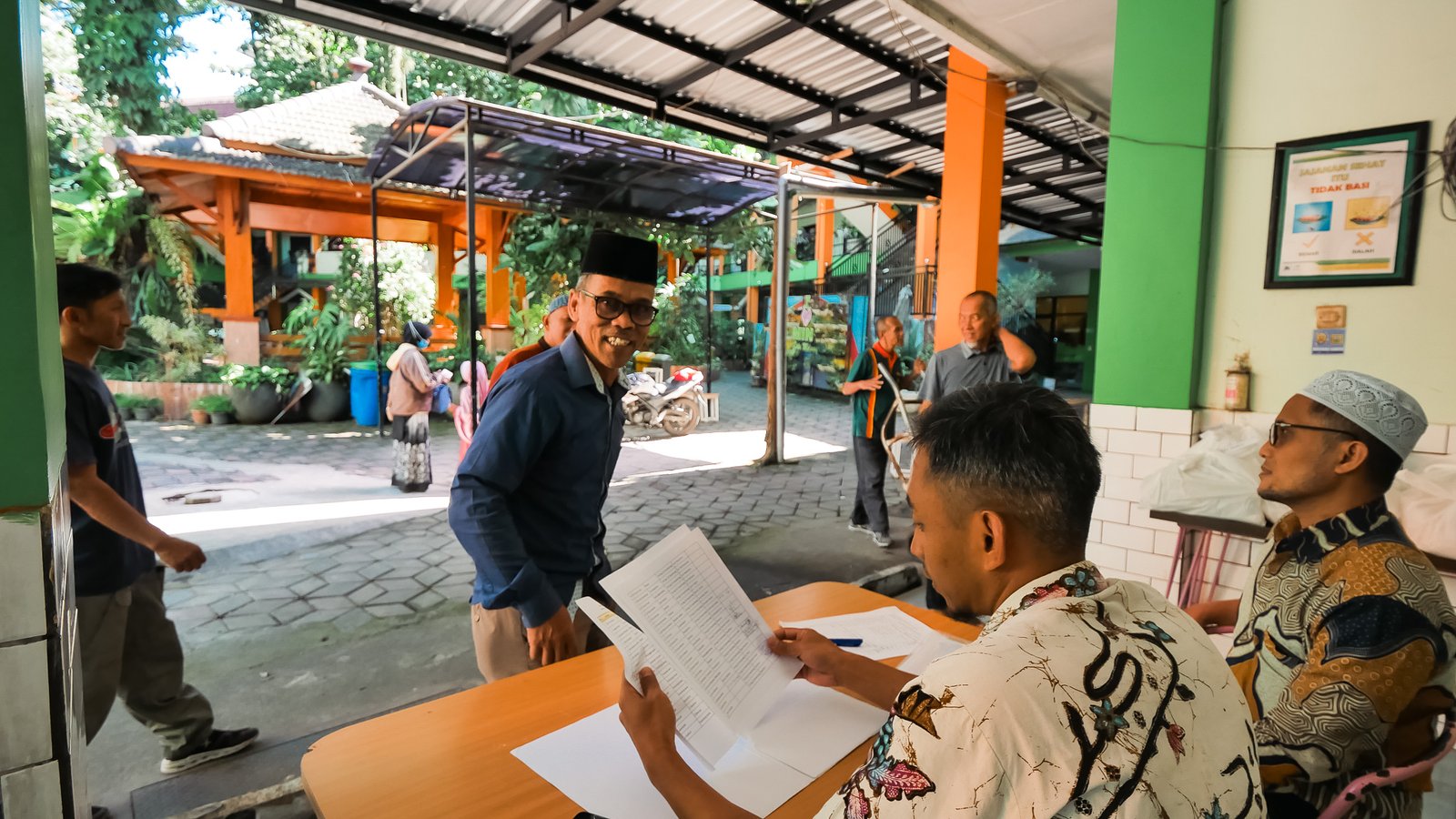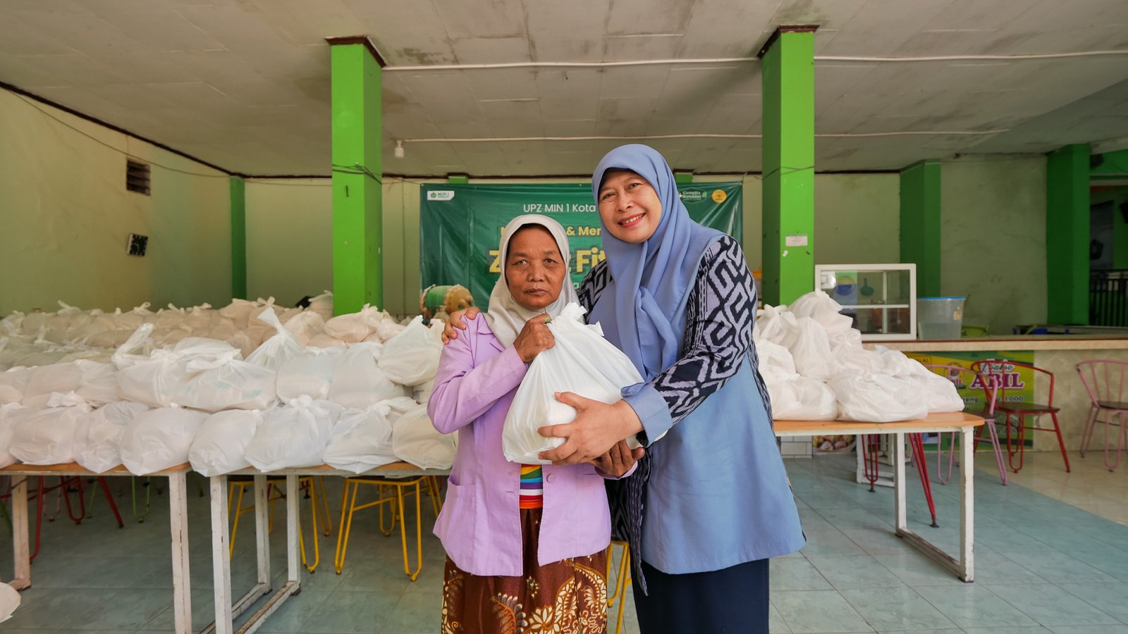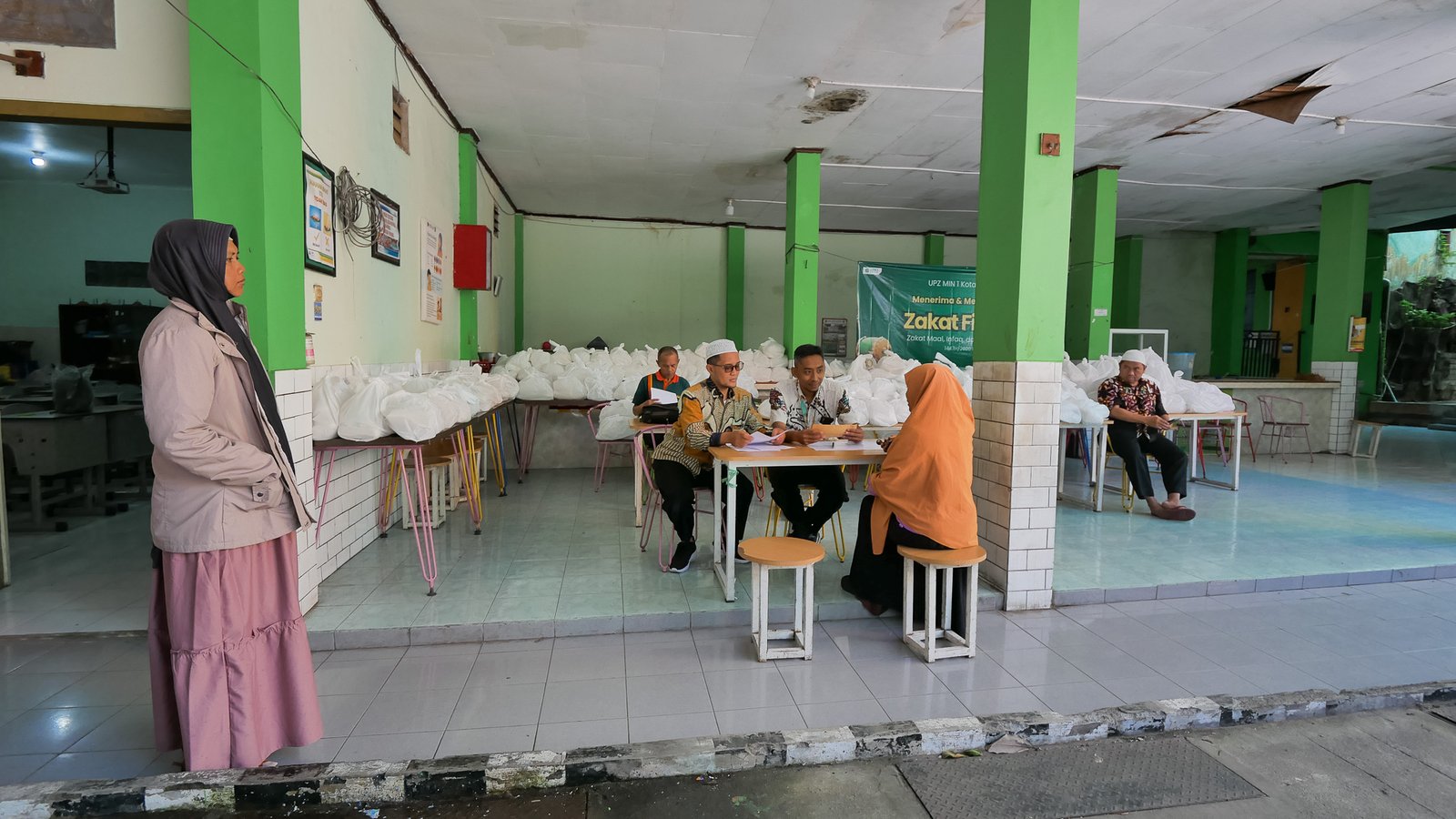 Kepala MIN 1 Kota Malang, Hj. Siti Aisah, S.Ag., M.Pd., turut hadir dan secara langsung mengawal proses pembagian zakat agar penyalurannya berjalan tertib dan tepat sasaran.