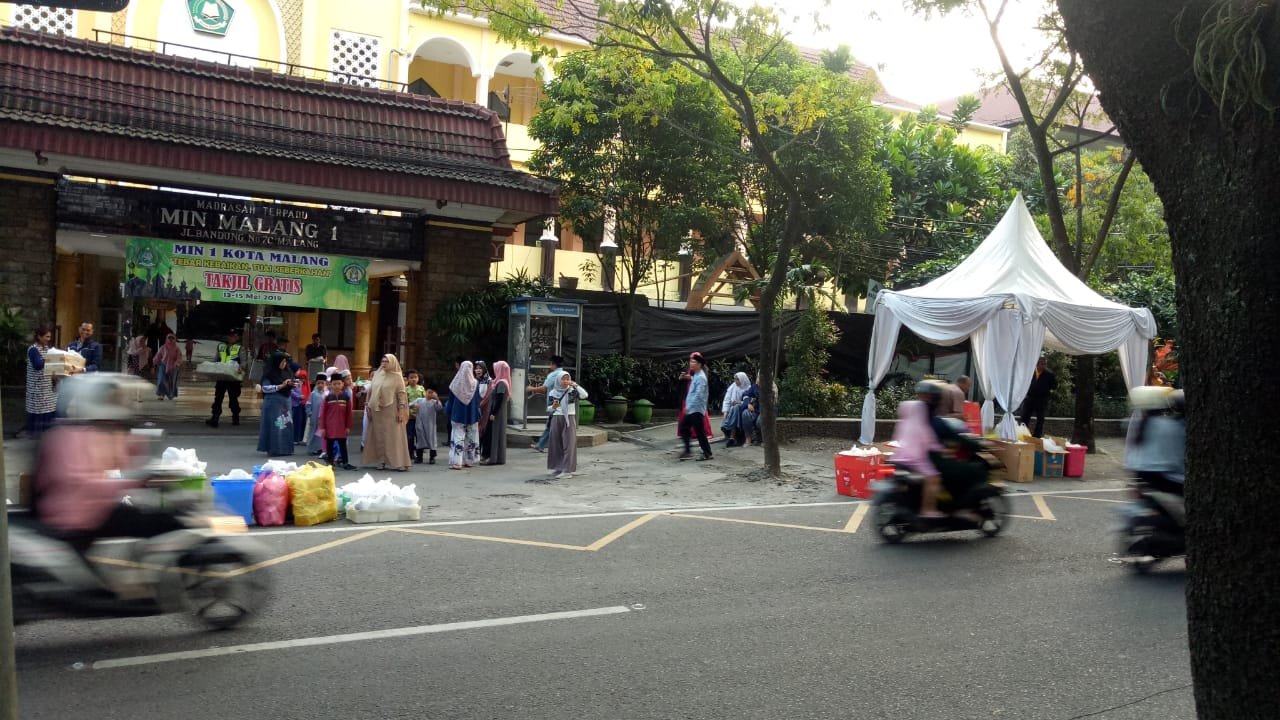 Kota Malang – (MIN 1) Selama tiga hari sejak Senin (13/5) puluhan siswa MIN 1 Kota Malang beserta guru dan orang tua siswa terlihat bersemangat saat membagikan ribuah paket takjil gratis kepada pengguna Jalan Bandung. Demi keamanan dan kelancaran kegiatan MIN 1 Kota Malang meminta bantuan kepada aparat TNI dan Kepolisian.