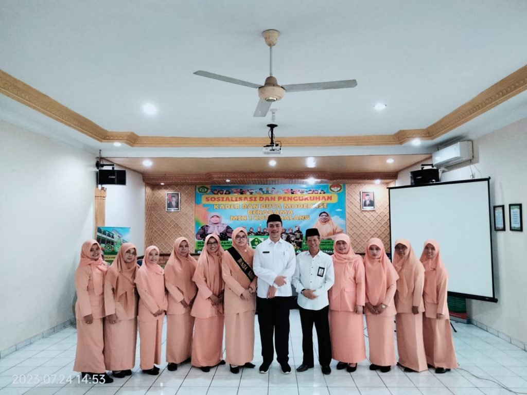 Kota Malang (MIN 1) – Sosialisasi serta Pengukuhan Kader dan Duta Moderasi Beragama MIN 1 Kota Malang dilaksanakan Senin, 24 Juli 2023 di aula MIN 1. Kegiatan ini dihadiri oleh Kepala Kementerian Agama Kota Malang Achmad Shampton, S.HI, M.Ag., Kasi Penma Abdul Mughni S.Ag ,M.Pd., dan beberapa guru serta pengurus Darma Wanita MIN 1 Kota Malang.
