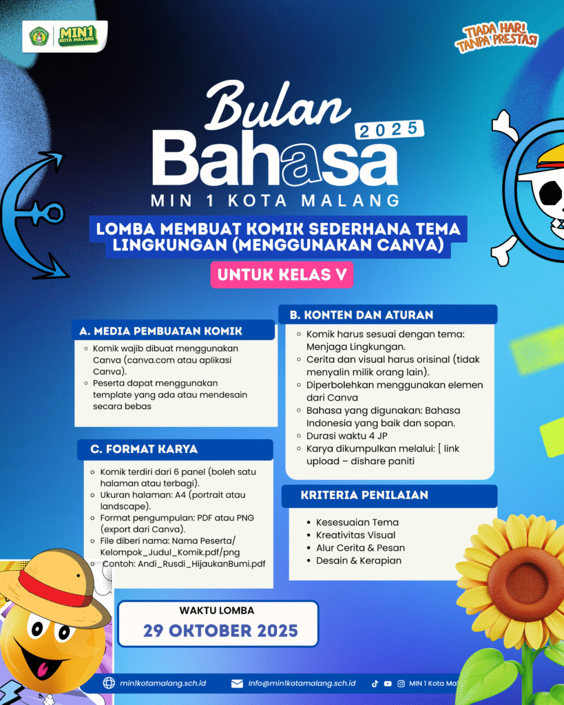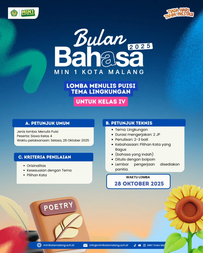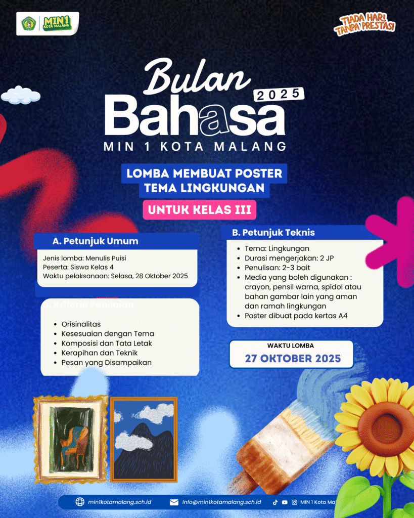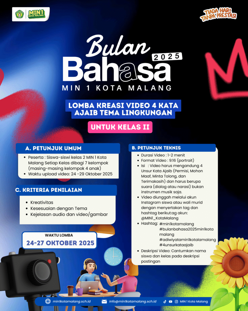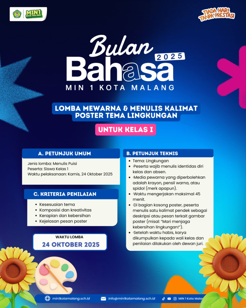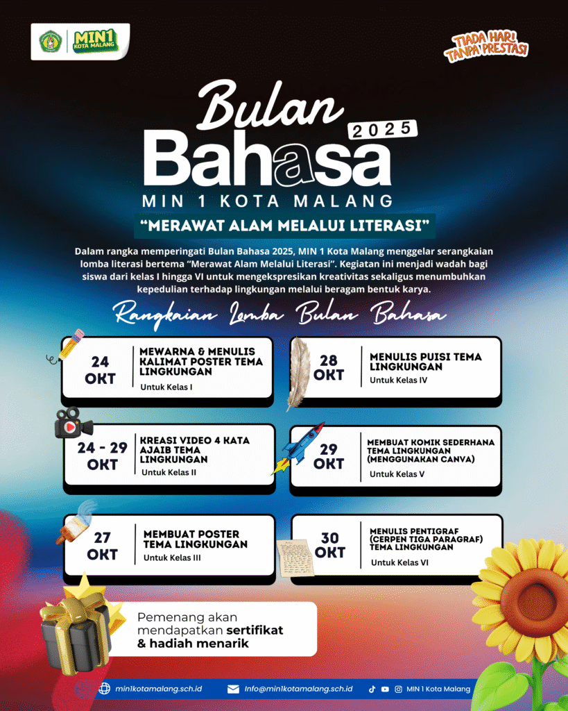 Dengan tema “Merawat Alam Melalui Literasi”, Bulan Bahasa 2025 di MIN 1 Kota Malang menjadi momentum berharga untuk menanamkan nilai-nilai cinta lingkungan dan memperkuat karakter literat di kalangan generasi muda madrasah.