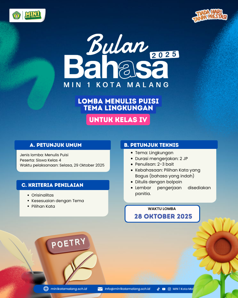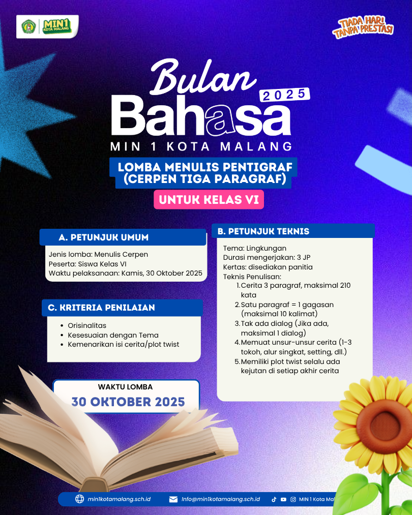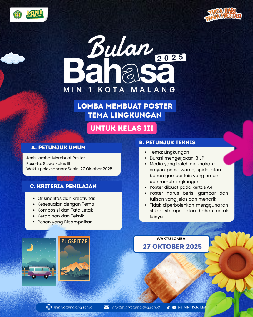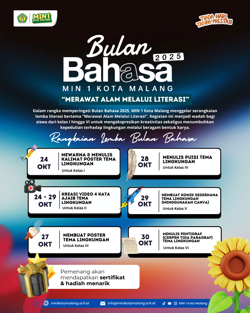 Kota Malang, M1NEWS – Kota Malang – Dalam rangka memperingati Bulan Bahasa 2025, MIN 1 Kota Malang menggelar serangkaian lomba literasi bertema “Merawat Alam Melalui Literasi.” Kegiatan ini menjadi wadah bagi siswa kelas I hingga VI untuk mengekspresikan kreativitas sekaligus menumbuhkan kepedulian terhadap lingkungan melalui beragam bentuk karya.