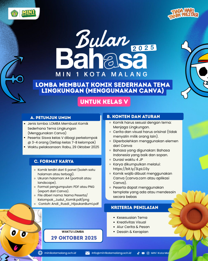 Lomba ini diikuti siswa kelas V dalam kelompok beranggotakan 3–4 orang. Peserta membuat komik digital minimal 6 panel bertema Menjaga Lingkungan menggunakan aplikasi Canva. Karya dikumpulkan dalam format PDF atau PNG (hasil ekspor Canva) dan diberi nama file: NamaPeserta_Judul_Komik.pdf.