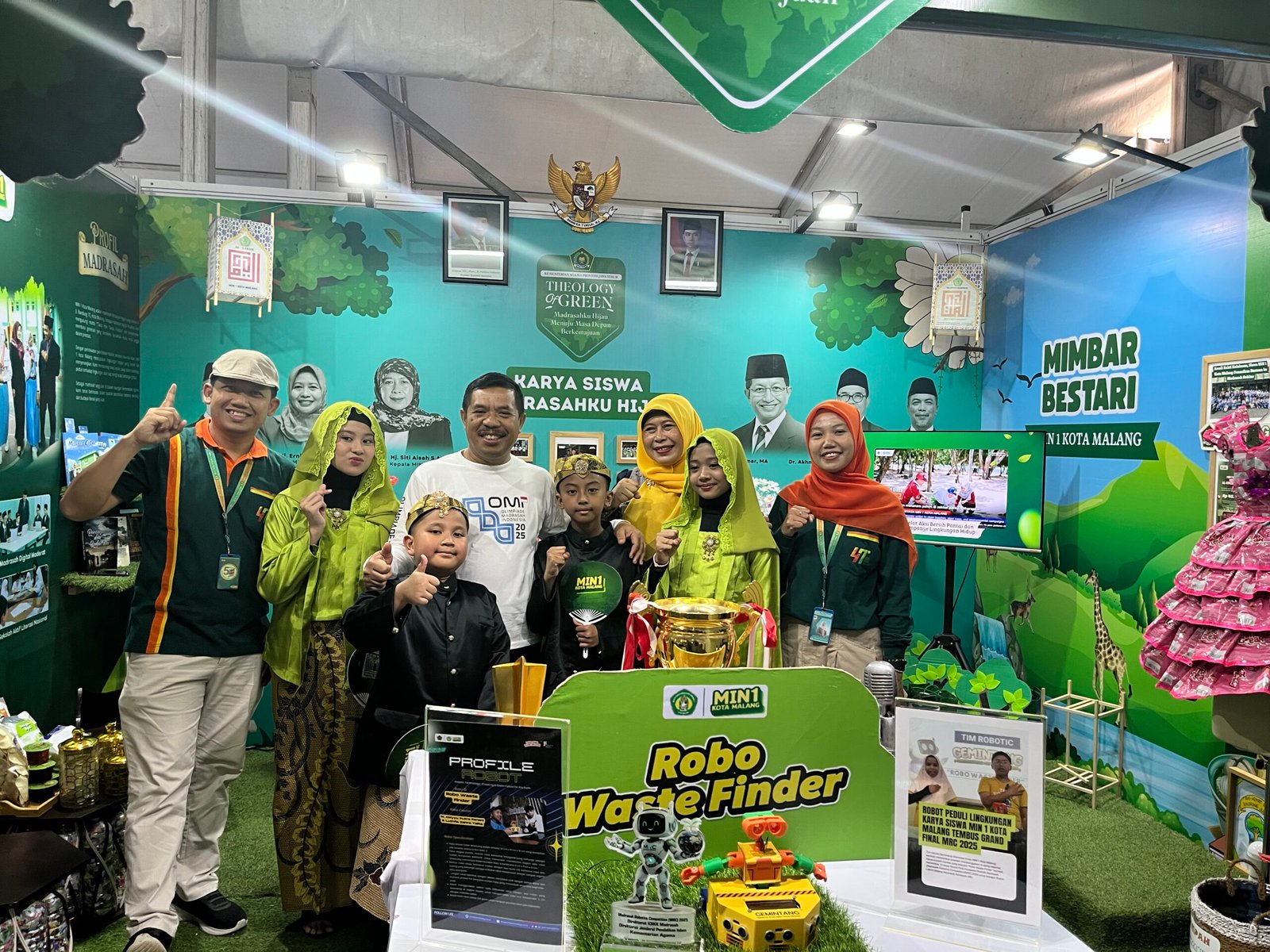 Di bagian central booth pengunjung langsung disambut oleh karya monumental siswa MIN 1 Kota Malang, yakni Robo Waste Finder robot pendeteksi jenis sampah organik dan anorganik. Karya ini menjadi centerpiece booth sekaligus ikon edukatif tentang kepedulian lingkungan. Robot tersebut dilengkapi dengan papan informasi prestasi sebagai finalis Madrasah Robotic Competition (MRC) 2025, serta diorama taman dan air mancur mini yang melambangkan kesejukan dan kehidupan bumi. Kehadiran robot ini menjadi simbol sinergi antara teknologi, literasi, dan nilai-nilai keagamaan yang diusung MIN 1 Kota Malang.