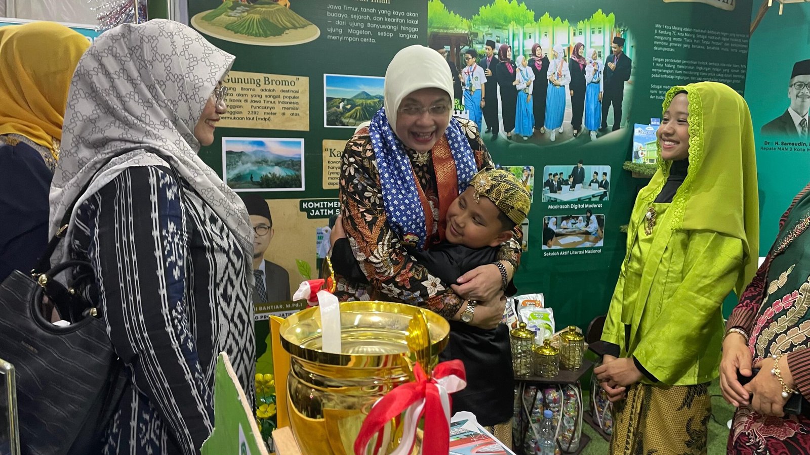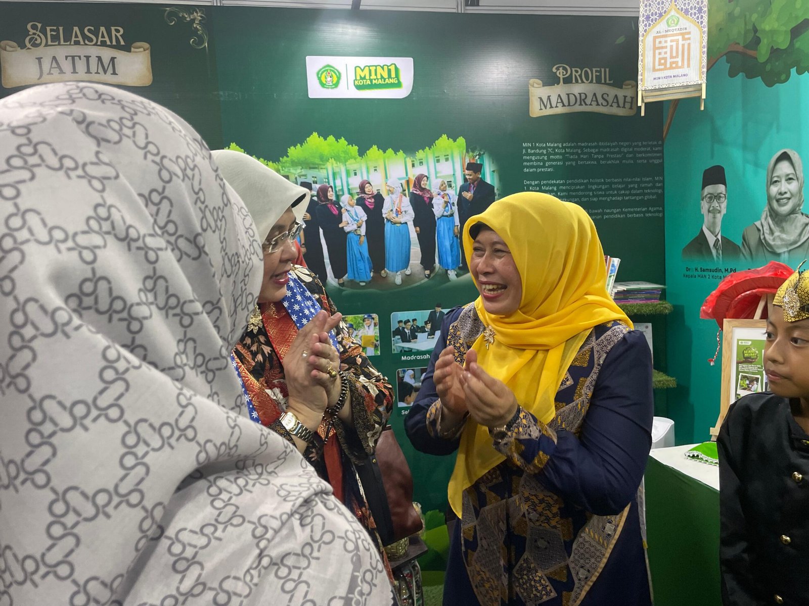 Siswa-siswi kader booth, yakni Haidar, Devan, Kimi, dan Yuki, tampil elegan mengenakan busana adat Jawa Timur, menyambut tamu dengan ramah, didampingi oleh Kepala MIN 1 Kota Malang, Hj. Siti Aisah, S.Ag., M.Pd.